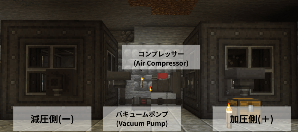 -が減圧側、+がコンプレッサーがある側(加圧側)です。↓