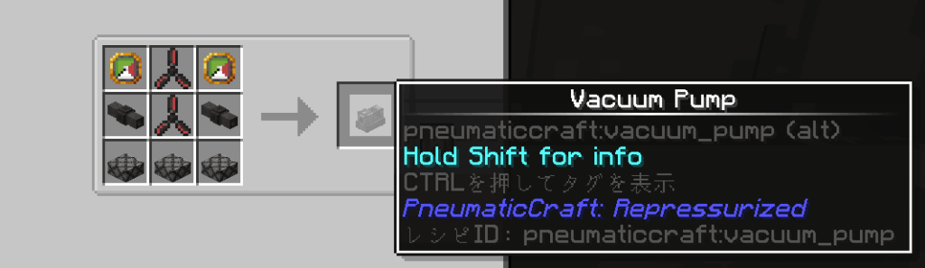 さて、具体的な使用方法ですが、Pneumatic Craftの細かいアイテムの作り方は省きます。